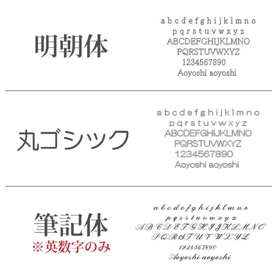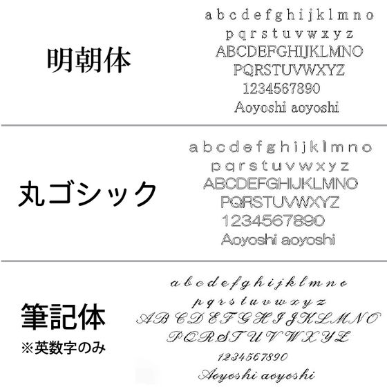 筆記体は英数字のみです。ひらがななど英数字以外をご入力いただいた場合「明朝体」にて刻印いたします。