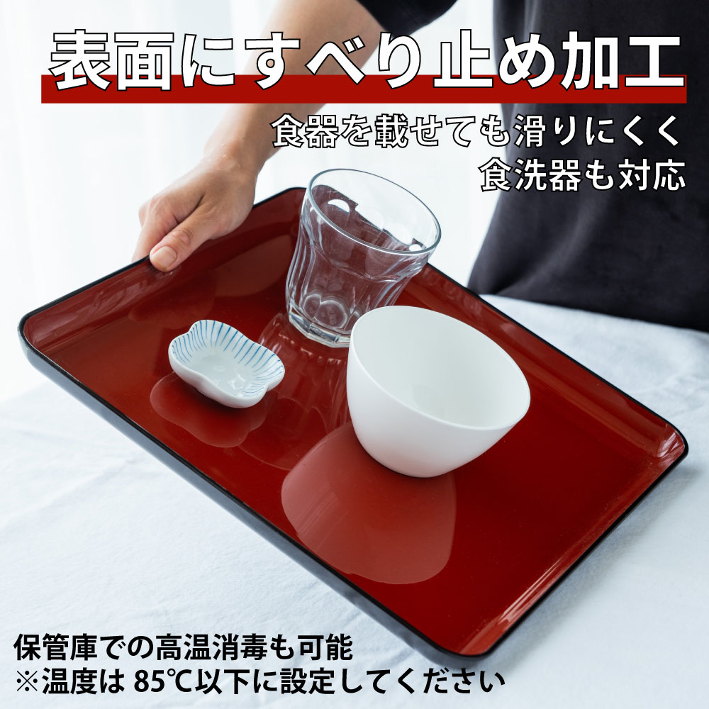 食事中、おわんやお皿がうっかり滑ってしまうなんてことありますよね? このトレーは天面に滑り止め加工を施してありますので、トレーにのせた 食器を滑りにくくさせてくれます。ノンスリップなこのトレーなら配膳も楽々。また、うっかりこぼしてしまってもトレーのふちに高さがありますので、トレーの中だけで汚れが収まりテーブルが汚れないのも嬉しいところです。トレーは、水洗いできるので、食事後はサッと洗って布巾で拭くだけで簡単キレイに。 実用的なトレーで食卓を彩りませんか。 食洗機・熱風消毒保管庫での高温消毒が可能です。 *温度は85℃以下に設定して下さい。