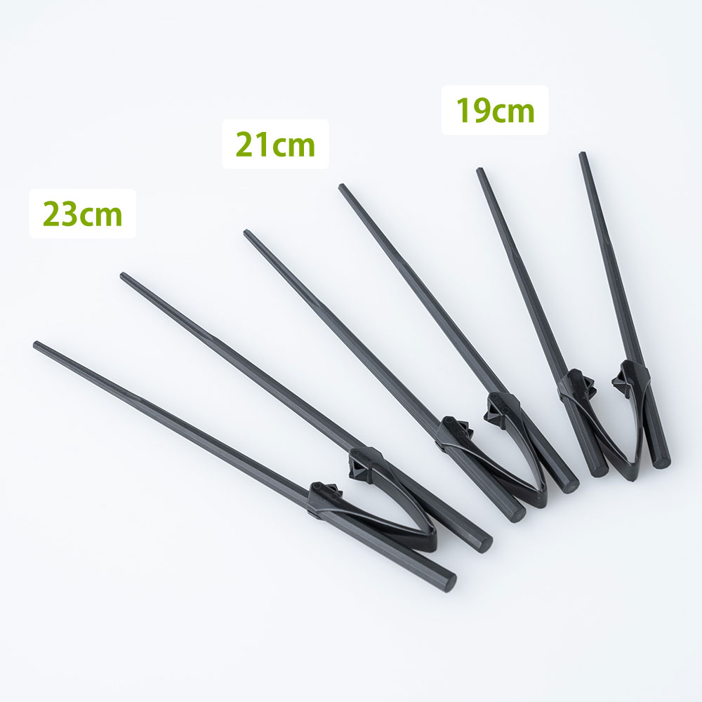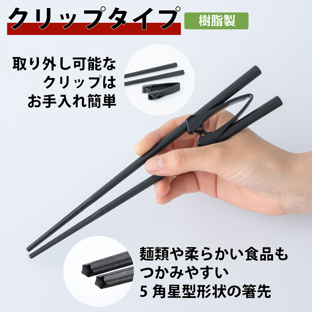 クリップタイプは箸先の断面が5角星型の形状のため、つかみにくい麺類や柔らかいお豆腐などの食品もしっかりつかむことができます。クリップは取り外しができるため、持ち運ぶ際も邪魔になりません。食洗機を使って洗うことができます。クリップタイプは、樹脂製の3サイズ展開です。