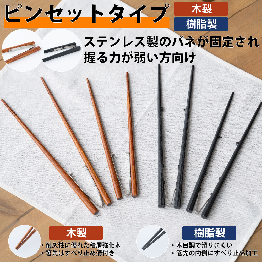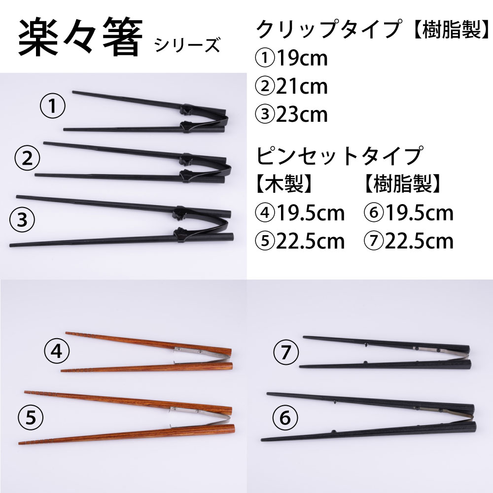 「慣れ親しんだお箸を使い続けたい」という願いを叶える楽々箸シリーズ。利き手に関係なく使える楽々箸は、手の指の変形や握力が低下してしまった人はもちろん、怪我などで指がうまく使えない人や、お箸を使いなれていない外国人の方にもオススメです。クリップタイプは、クリップのバネの力が50gと軽い握り心地で、通常の箸の動きへと誘導してくれます。