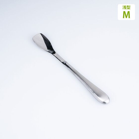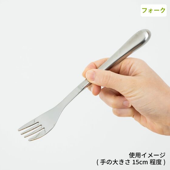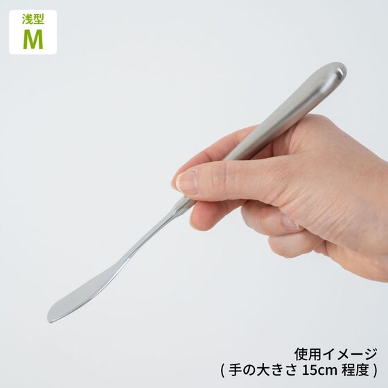 ライトシリーズは、口を大きく開けにくい方でも食べやすいよう、スプーンフォークともに一般的なものよりも小さく作っています。スプーンのヘッド部はどの角度からでも食事ができるよう丸い形で、手前が深く持ち手に行くにつれて浅くなっています。そのためスプーンにすくった食事は手前の深い部分に残り食事がしやすくできています。また、ライトフォークシリーズの歯は短めに設計されています。刃が長くないので安全ですが、食品をしっかり刺すこともできます。